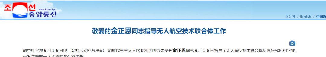 朝鲜劳动党总书记、朝鲜国务委员长金正恩9月18日指导了无人航空技术联合体所属研究所和企业研发生产的无人武器装备性能试验。当天,金正恩还审批了一个重要计划文件,它反映有关进一步扩大和加强无人航空技术联合体技术潜能的组织机构对策方案。