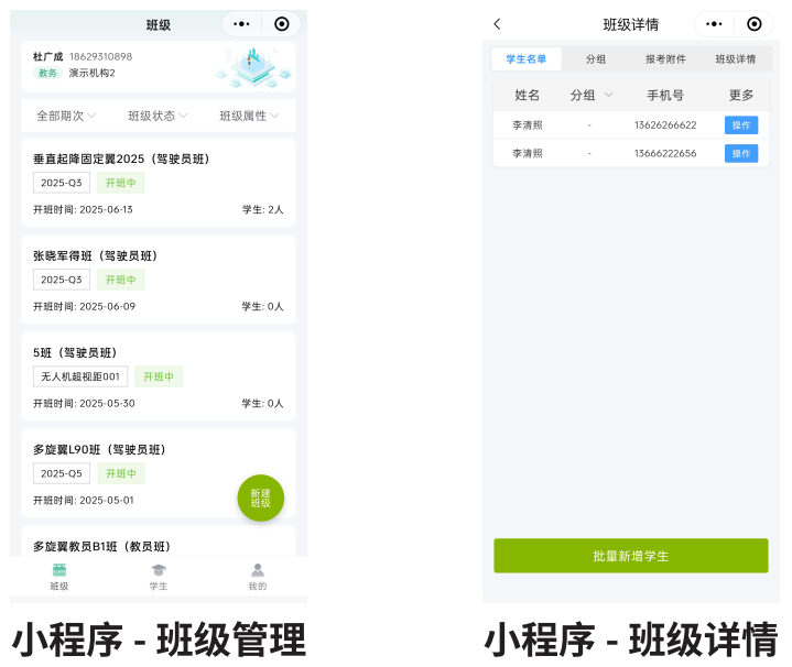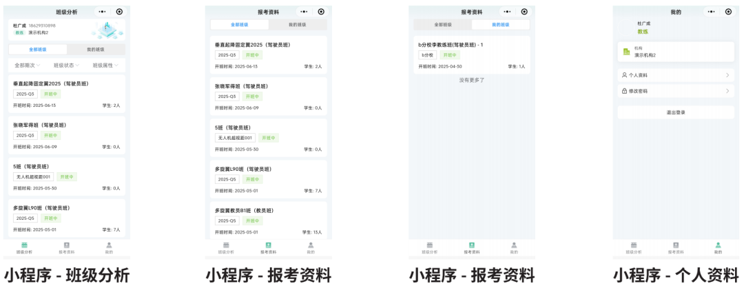 “易飞宝典” 小程序,作为移动端的教学工具,方便教练随时查看班级开班情况、学员个人资料及学习动态等。
