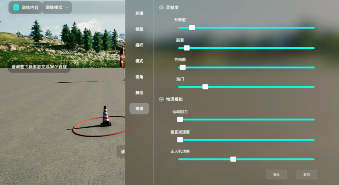 平台支持各个通道灵敏度自主调节,提供高级物理模拟设置:运动阻力、垂直减速度、无人机功率,让手感与实操飞行保持一致。