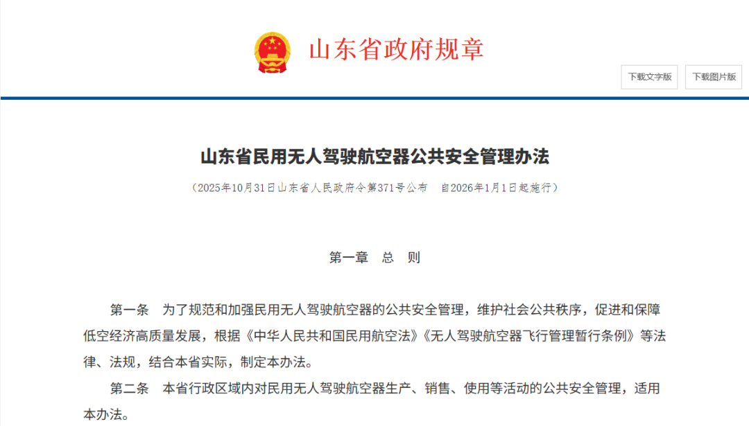 11月4日,山东省人民政府正式发布《山东省民用无人驾驶航空器公共安全管理办法》,自2026年1月1日起施行。该办法旨在规范和加强民用无人驾驶航空器的公共安全管理,维护社会公共秩序,促进和保障低空经济高质量发展。