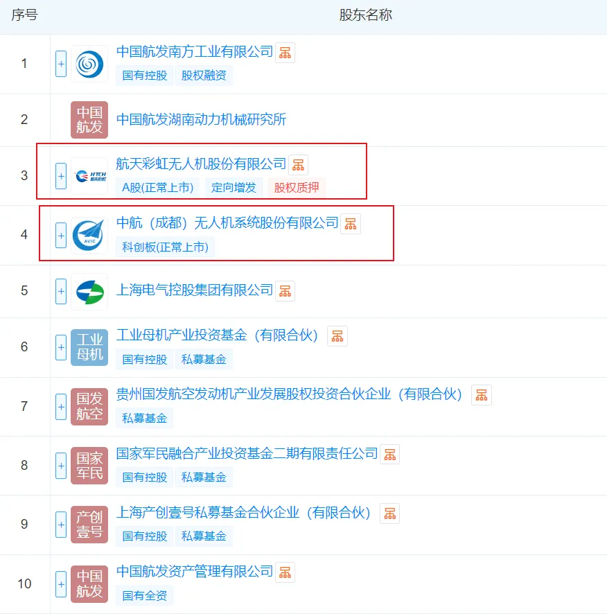 股东名单显示,该公司汇聚了产业链多方力量:中国航发南方工业有限公司以26.59%持股比例为第一大股东,中国航发湖南动力机械研究所持股19.12%。值得注意的是,工业母机产业投资基金和国家军民融合产业投资基金二期各持股14.29%,而无人机上市公司中无人机和航天彩虹分别持股2.86%。